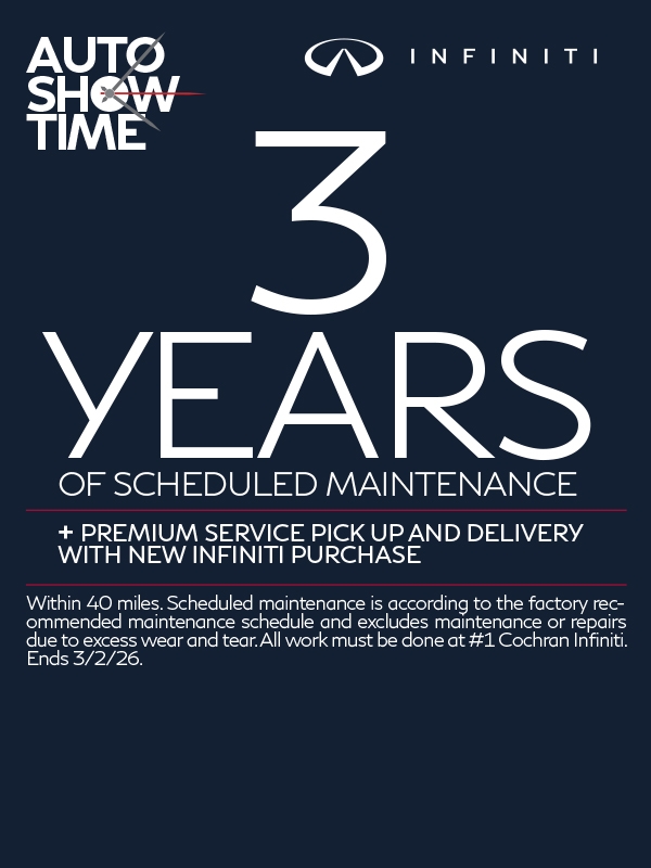 Within 40 miles. Scheduled maintenance is according to the factory recommended maintenance schedule and excludes maintenance or repairs due to excess wear and tear. All work must be done at #1 Cochran Infiniti. Ends 3/2/26.